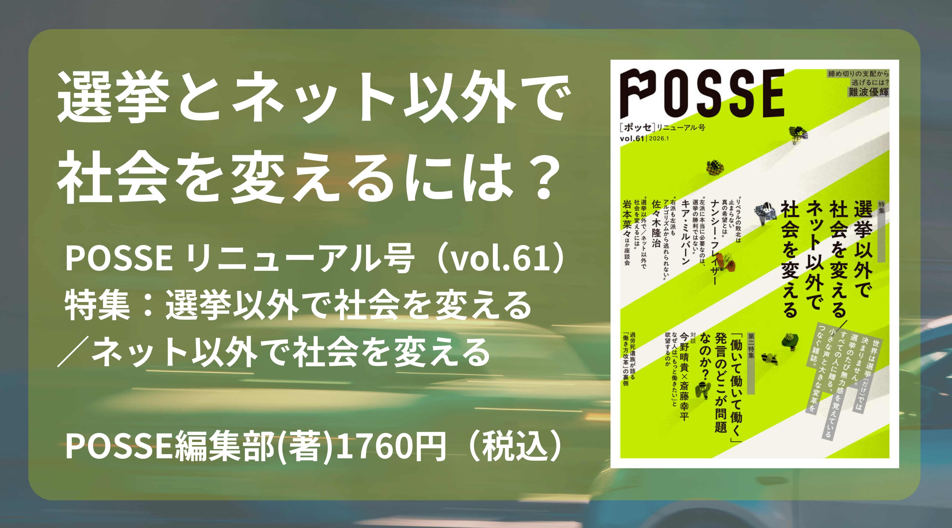 『POSSE vol.61(特集:選挙以外で社会を変える/ネット以外で社会を変える)』 堀之内出版 【リニューアル号】 「小さな声と大きな変革をつなぐ雑誌」POSSEが、デザインを新たにリニューアル! 特集:選挙以外で社会を変える/ネット以外で社会を変える 第二特集:「働いて働いて働く」発言のどこが問題なのか? 世界は選挙(だけ)では決まらない──。 選挙のたび無力感に苛まれているすべての人に。 【巻頭言より】 “今回の特集は、「選挙以外で社会を変える/ネット以外で社会を変える」です。2025年12月現在、日本では物価高騰が続き、生活は厳しさを増しています。不安を抱えている人たちは多いはずです。しかし、貧困や労働問題に取り組むはずの政党が人気を集めているとは言えません。それどころか、一見正反対に見える高市政権や、参政党が大きな支持を得ているように見えます。こうした現実を前に、選挙のたび無力感に苛まされている方も多いのではないでしょうか。 そんな中で、私たちは社会を変えるための「希望」を見出そうと考えています。ただし、それは「これまでのやり方で大丈夫」ということではありません。 気づけば私たちは、SNSで誰かを攻撃したり、慰め合ったり、選挙が近づけば、政党について書き込むことばかりして、それで社会を変えている気になっていないでしょうか。この社会と闘い、社会を変えるための方法は、本当にそこにあるのでしょうか。 「選挙」と「ネット」。社会を変えるための私たちの想像力は、この2つに縛られすぎています。そんな思いから、雑誌『POSSE』は今回、新たにリニューアルしました。” 目次 【特集:選挙以外で社会を変える/ネット以外で社会を変える】 リベラルの敗北は止まらない 真の希望とは ──フェミニスト・政治学者ナンシー・フレイザー来日インタビュー ナンシー・フレイザー 左派に本当に必要なのは、選挙の勝利ではない ──左傾化する若者(ジェネレーション・レフト)の新局面 キア・ミルバーン 右派も左派もアルゴリズムからは逃れられない ──現代を覆う「レント資本主義」解説 佐々木隆治 選挙以外で/ネット以外で社会を変えるには ──参政党、NY市長選、排外主義、メガソーラーetc… POSSE座談会 【第二特集:「働いて働いて働く」発言のどこが問題なのか?】 過労死遺族が語る「働き方改革」の裏側 ──「働いて働いて働く」時代の長時間労働 過労死遺族対談 報道される過労死はたったの「4%」? ──なぜ人は「もっと働きたい」と欲望するのか 今野晴貴×斎藤幸平 スキマバイトで介護される時代 ──ウーバー以降、労働法の最前線 川上資人×今野晴貴 締め切りの支配から逃げるには? ──資本主義を変える「遊び」の哲学 難波優輝 = = = = = 連載 スポーツとブラック企業 体育会系言葉・話法を考える 常見陽平 コラム Mrs.GREEN APPLE「ライラック」は2020年代の労働歌か? 岩本菜々×坂倉昇平 ブックレビュー 定期購読・寄付・会員 バックナンバー紹介 POSSE活動紹介 編集後記